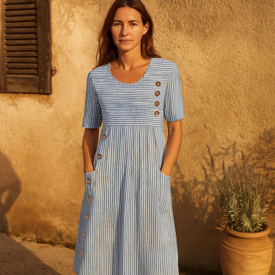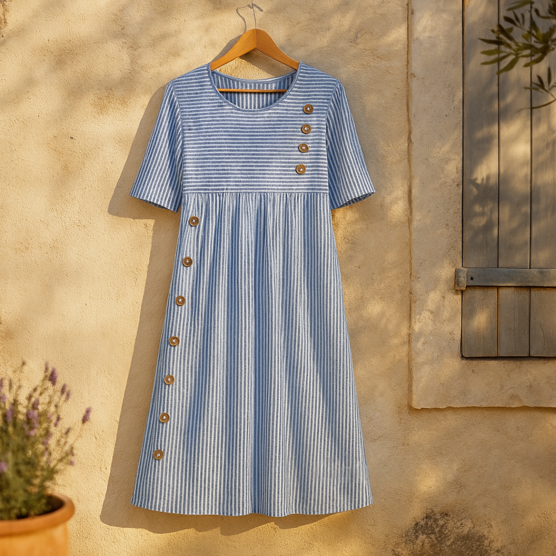 Este favorecedor vestido midi combina la ligereza y comodidad de un diseño que realza la silueta y cubre delicadamente el vientre. Su estampado de rayas atemporal aporta un toque clásico y refrescante, mientras que las mangas 3/4 amplias ofrecen una versatilidad aireada. El largo midi fluido garantiza una bonita cobertura y un equilibrio perfecto, ideal para los días cálidos en los que quieres sentirte elegante y cómoda. Perfecto para las salidas diarias, los mercados de fin de semana o un brunch informal.